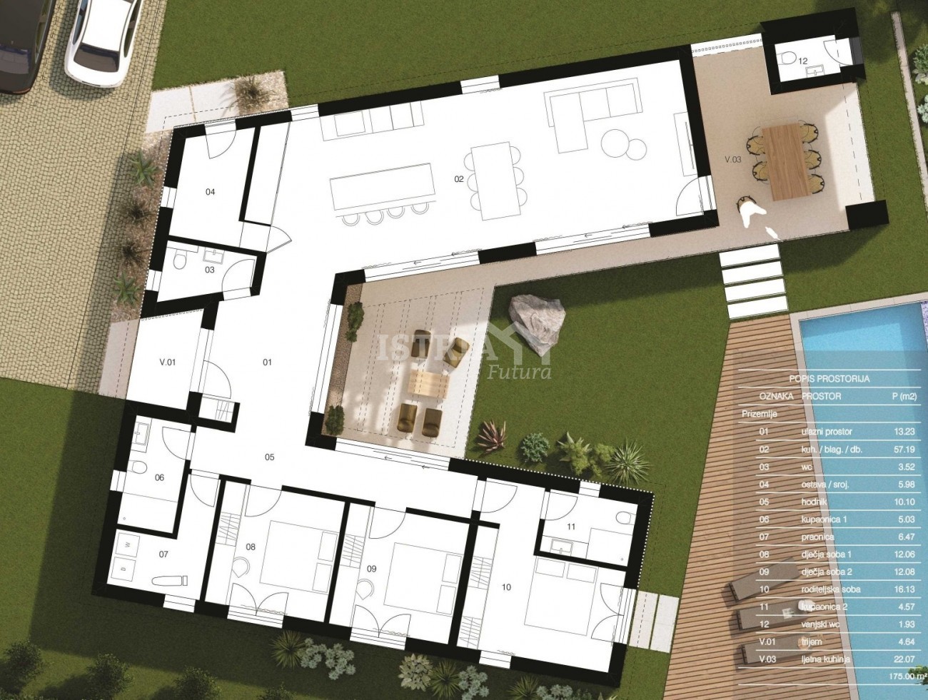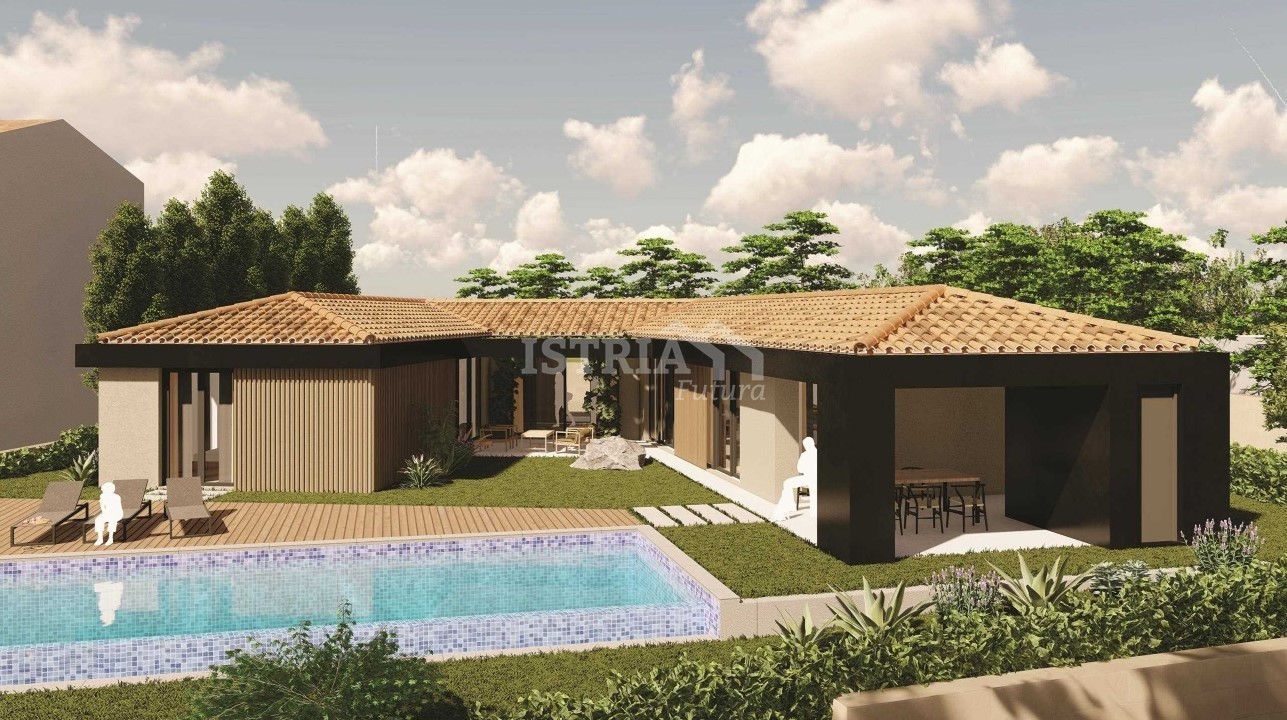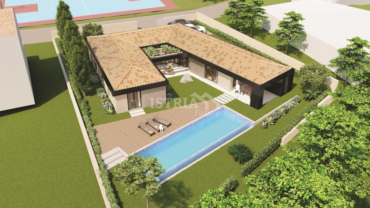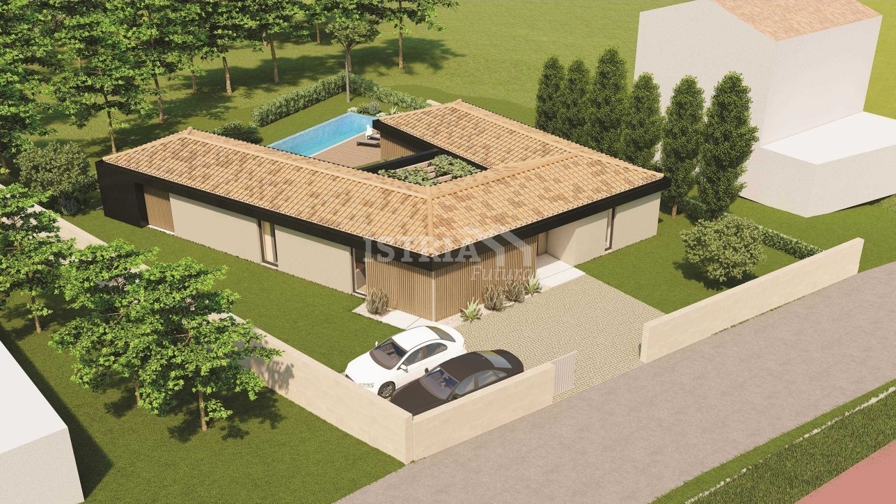 Na prodaju predivna, moderna, niskoenergetska prizemna vila površine 175 m2, smještena na ograđenom i uređenom zemljištu ukupne površine 934 m2, udaljena 9 km od centra Poreča i mora te samo 2 km od ulaza na Istarski Y (autocestu) i svih potrebnih sadržaje poput trgovina, škola itd.
