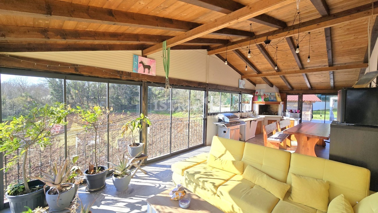 Il resto della casa si sviluppa su un unico piano: il piano terra è composto da un ingresso, 3 camere da letto, un bagno e una toilette, e un ampio soggiorno con cucina e zona pranzo, che si affaccia su una terrazza coperta e su un giardino splendidamente curato. Al piano inferiore si trova anche una bellissima terrazza chiusa, una sorta di "giardino d'inverno", che funge da ulteriore soggiorno con cucina e camino, o da luogo ideale per socializzare e organizzare incontri durante tutto l'anno.